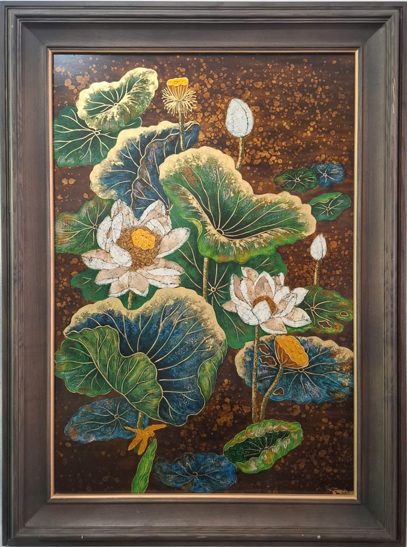 Những bông sen trắng tinh khôi nở rộ giữa lá sen xanh mướt và lá vàng ươm, nền nâu đậm làm nổi bật vẻ đẹp thanh cao. Bức tranh thể hiện biểu tượng của sự thanh tịnh, thuần khiết trong văn hóa Phật giáo và tâm hồn người Việt.