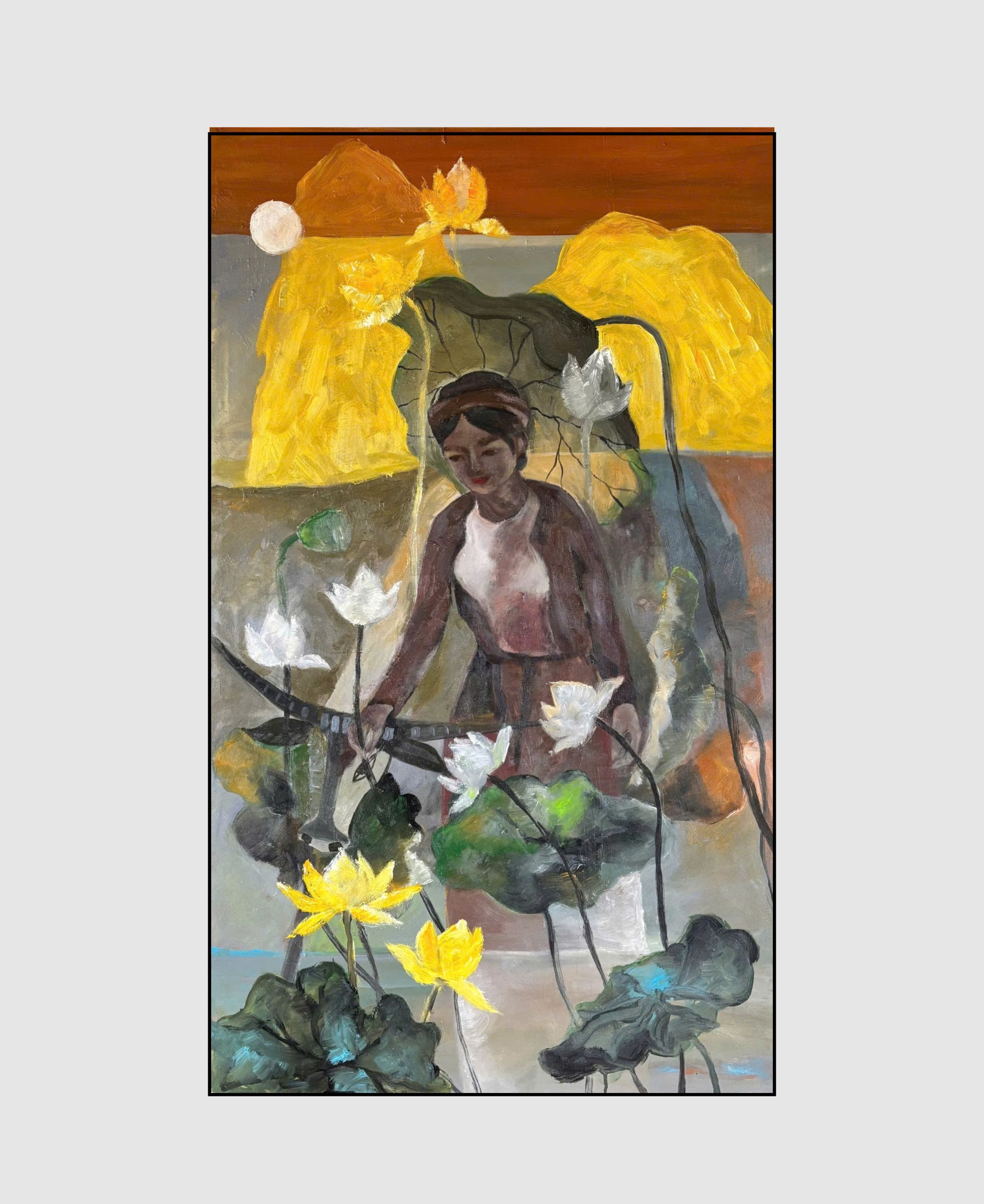Bức tranh mô tã hình ảnh thiếu nữ trong vườn sen. Đang đắm chìm trong hương sắc của hương đồng gió nội.