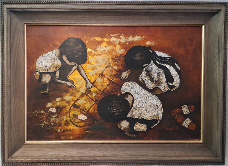Cảnh ba đứa trẻ đang chơi trò chơi dân gian ô ăn quan trên nền đất, ánh sáng vàng rực phủ khắp không gian. Bức tranh gợi nhớ về tuổi thơ của những đứa trẻ nông thôn, thể hiện nét văn hóa chơi truyền thống đơn giản nhưng đầy ý nghĩa của làng quê Việt.