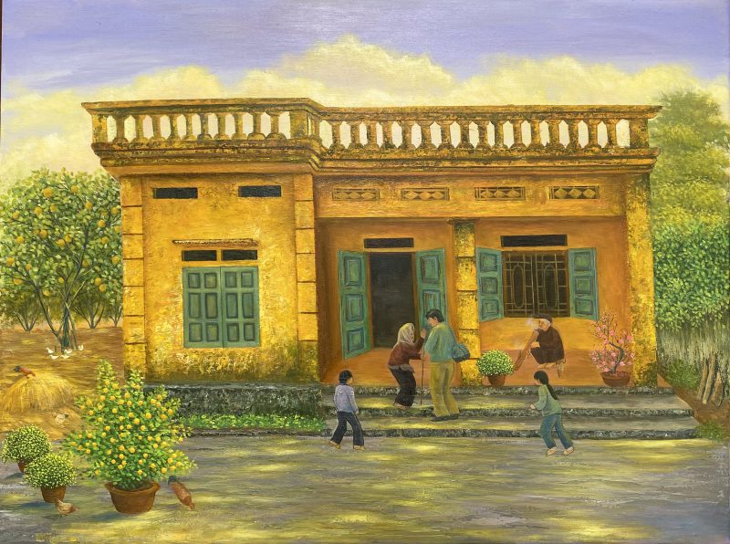 Bức tranh khắc họa khung cảnh quê yên bình với ngôi nhà vàng cổ kính, đào quất ngày Tết.đứa con sau bao năm đi. Làm xa trở về với Ông bà, cha mẹ và các cháu quây quần ấm áp, gợi nhớ tình thân, nỗi nhớ quê và hương vị Tết truyền thống Việt Nam đầy yêu thương, giản dị mà sâu lắng.