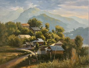 Tranh phong cảnh sớm bình yên đưa người xem đến một khung cảnh lãng mạn nên thơ, nơi mặt hộ nước phẳng lặng bên những tán cây, xa xa là những nóc nhà đang trong màn sương sớm.